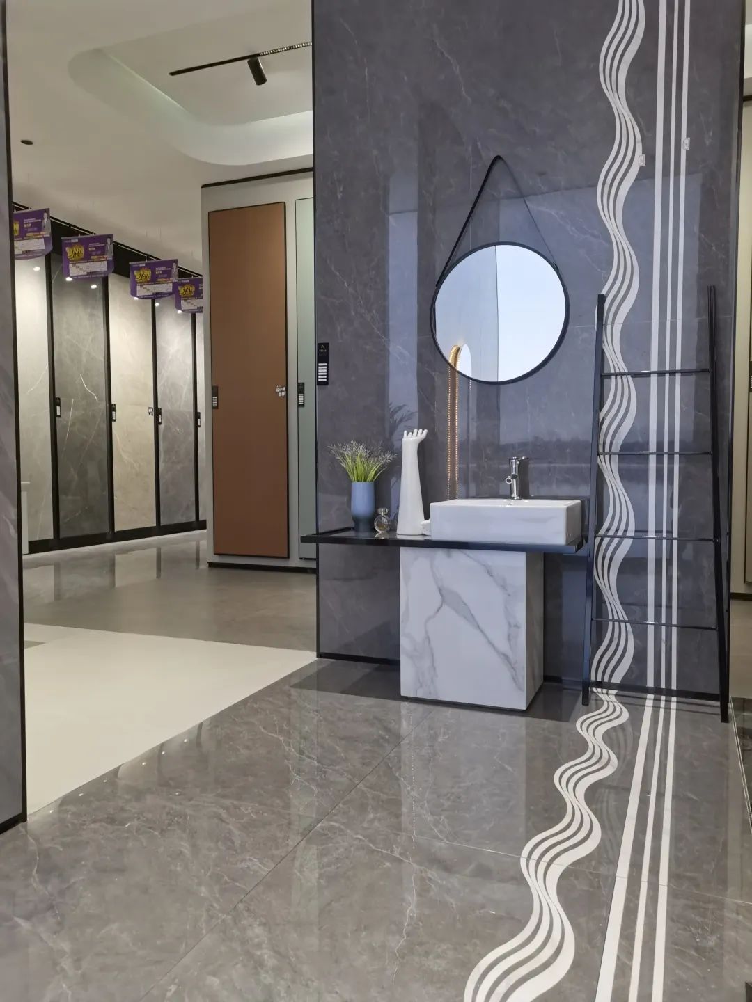 安顺雅奢门店整体融入独具一格的艺术设计,入口处宽阔无遮挡,给人一种开阔明朗的视觉效果。延伸至内部则是充满设计感的模拟间与选材区,高颜高值瓷砖在氛围灯的晕染下显得格外有质感。